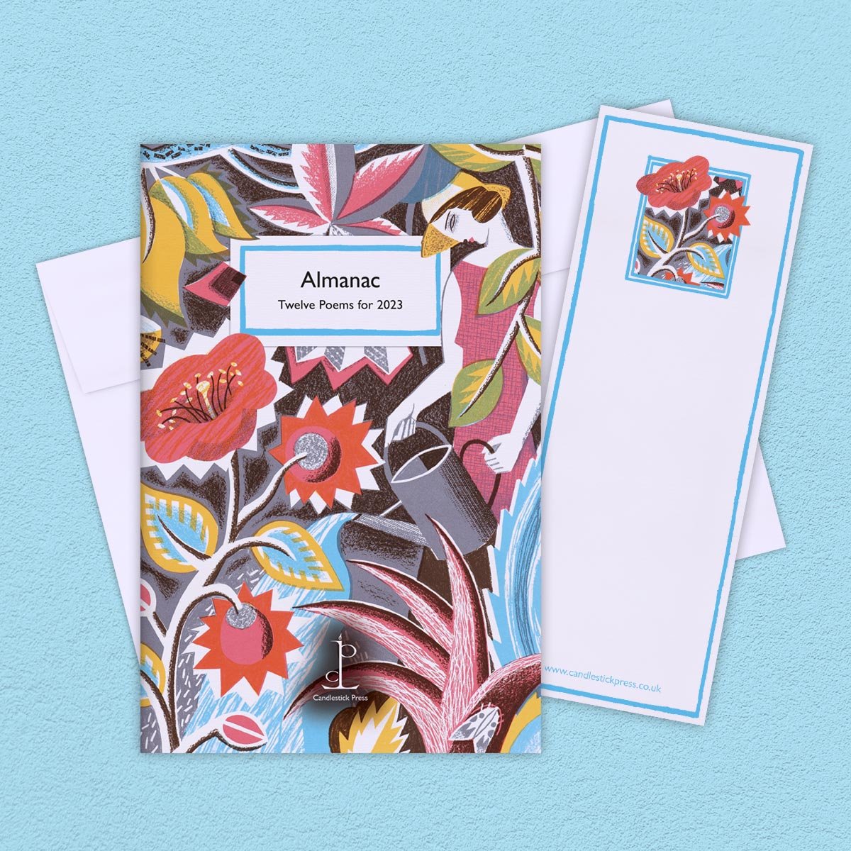 Pack image of the Almanac: Twelve Poems for 2023 poetry pamphlet on a decorative background