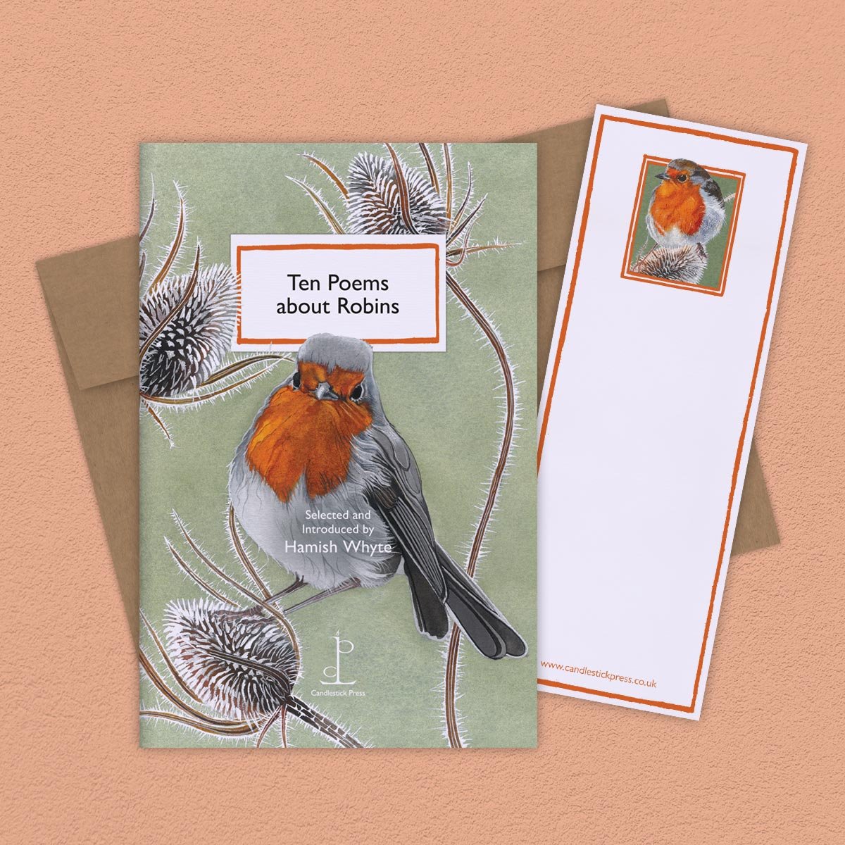 Postcard included with the Ten Poems about Robins poetry pamphlet on a decorative background