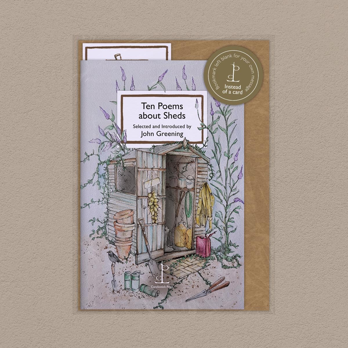 Pack image of the Ten Poems about Sheds poetry pamphlet on a decorative background