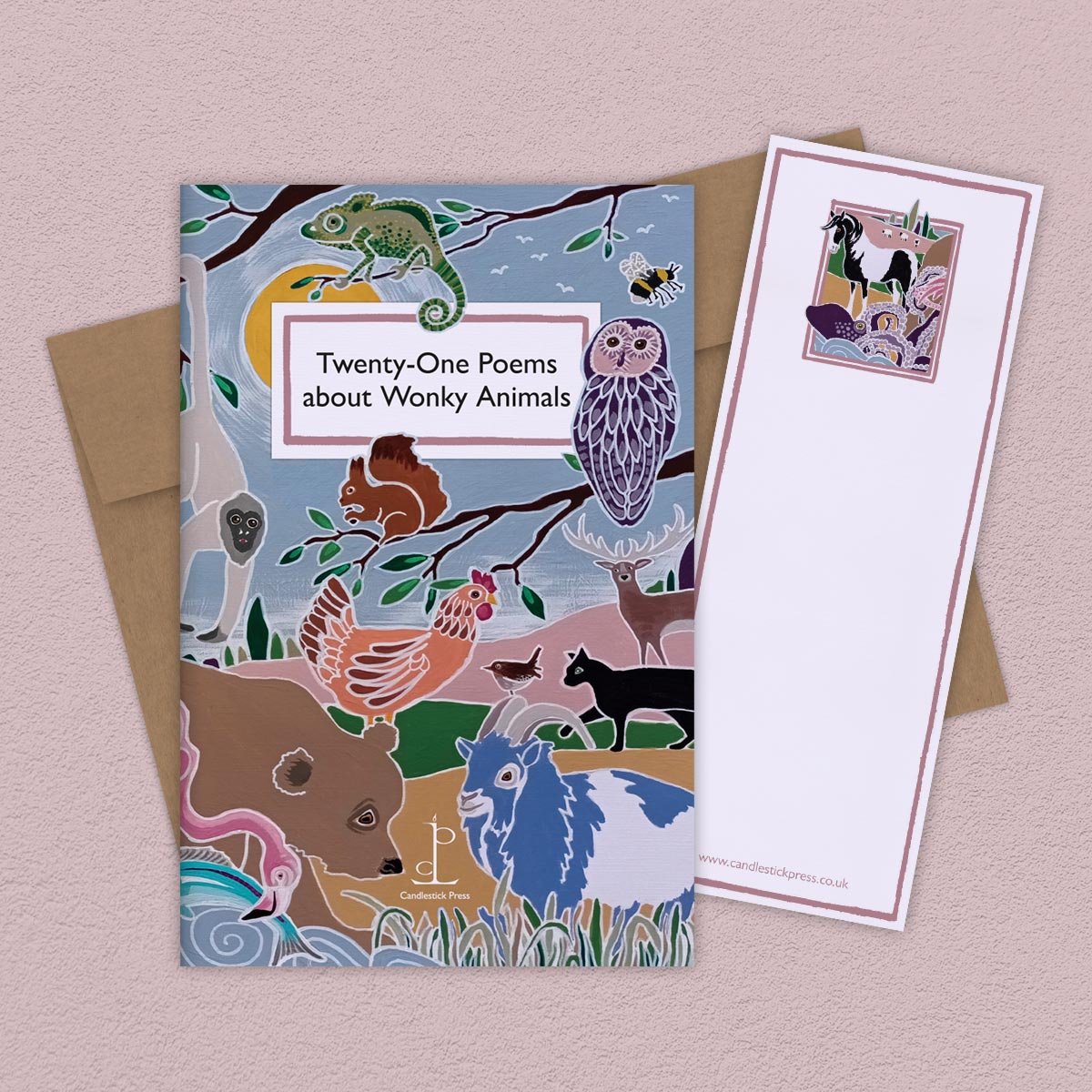 Group image of the Twenty-One Poems about Wonky Animals poetry pamphlet on a decorative background